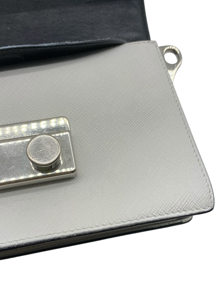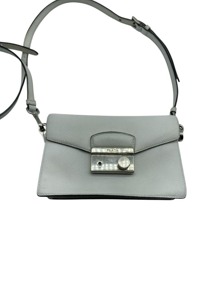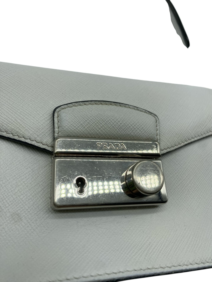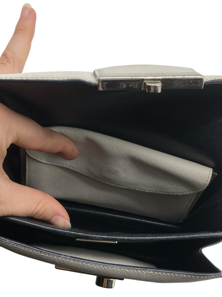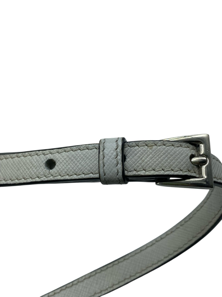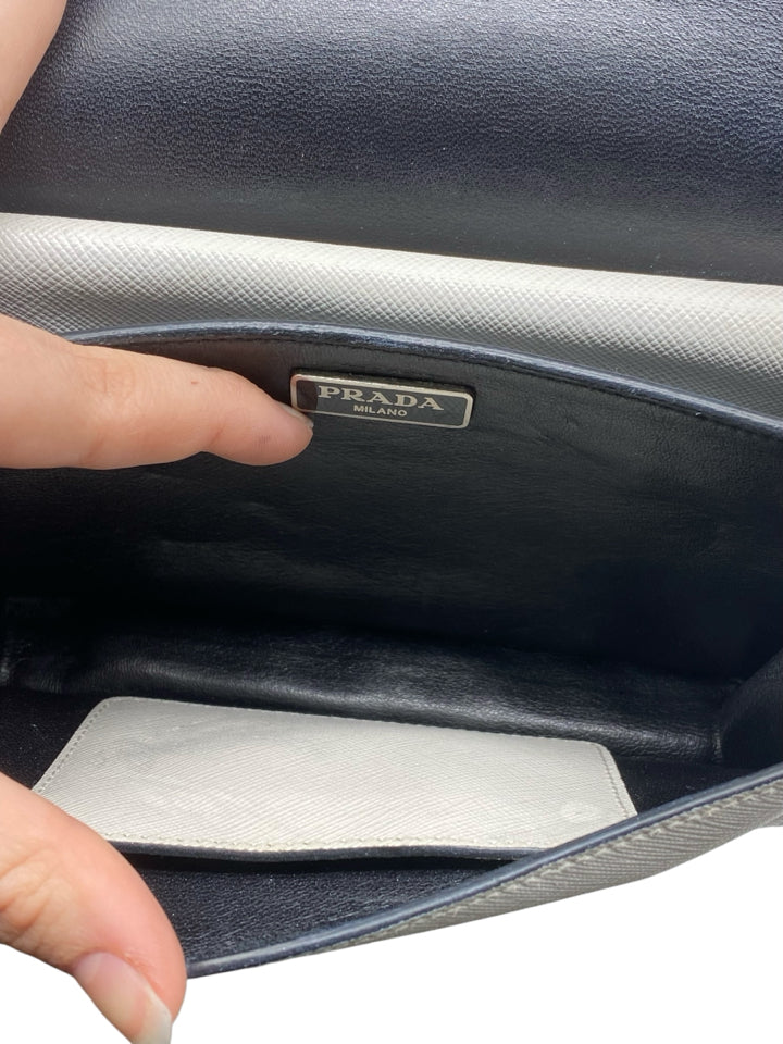 AS IS Prada Saffiano Leather Mini Crossbody in as is condition. Marks throughout leather, wear on corners, scratches and marks on interior, scratches on hardware, and slight warping & marks on strap (see pics). Measures approx. 7 x 2.5” x 4.5”. Strap drop measures approx. 20". Includes authentication certificate. (ah)