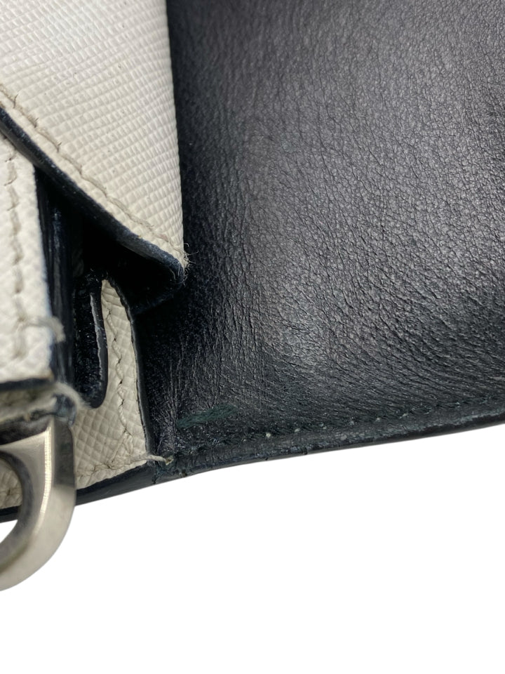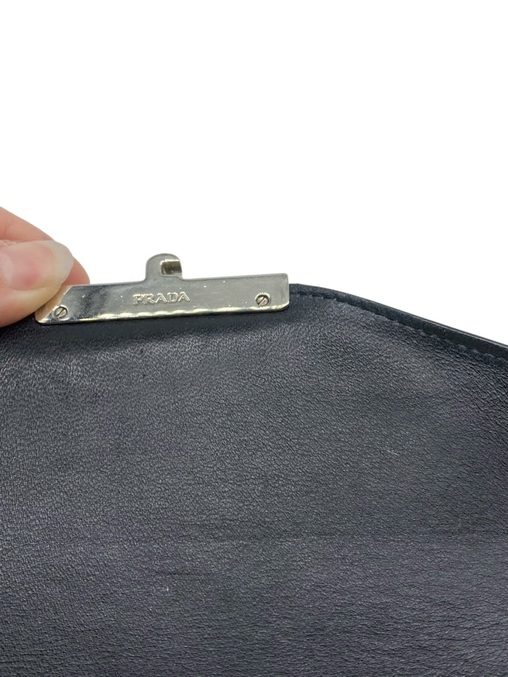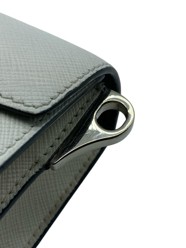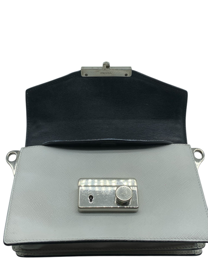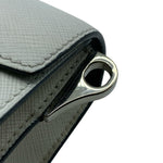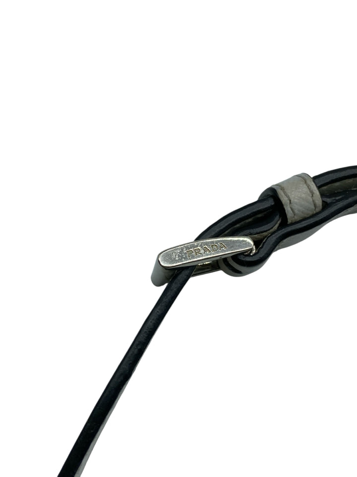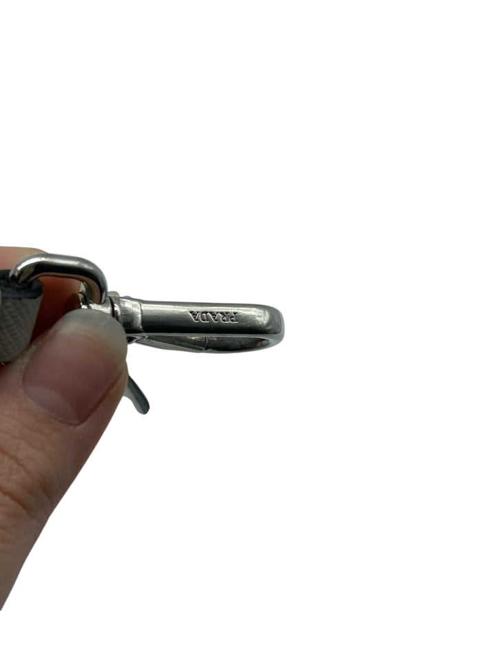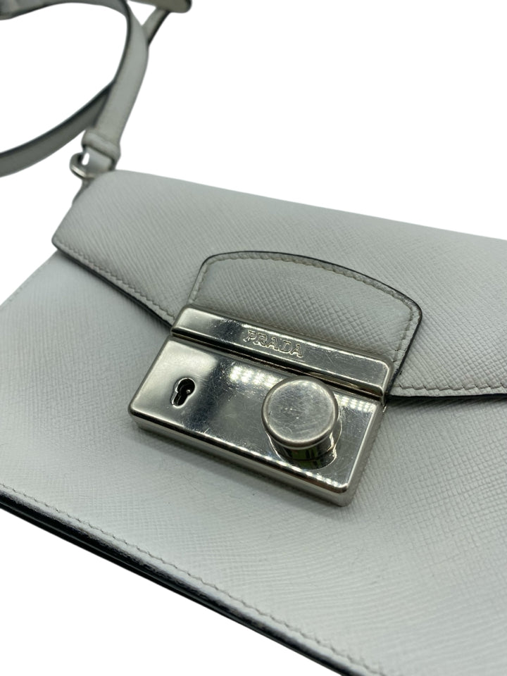 AS IS Prada Saffiano Leather Mini Crossbody in as is condition. Marks throughout leather, wear on corners, scratches and marks on interior, scratches on hardware, and slight warping & marks on strap (see pics). Measures approx. 7 x 2.5” x 4.5”. Strap drop measures approx. 20". Includes authentication certificate. (ah)